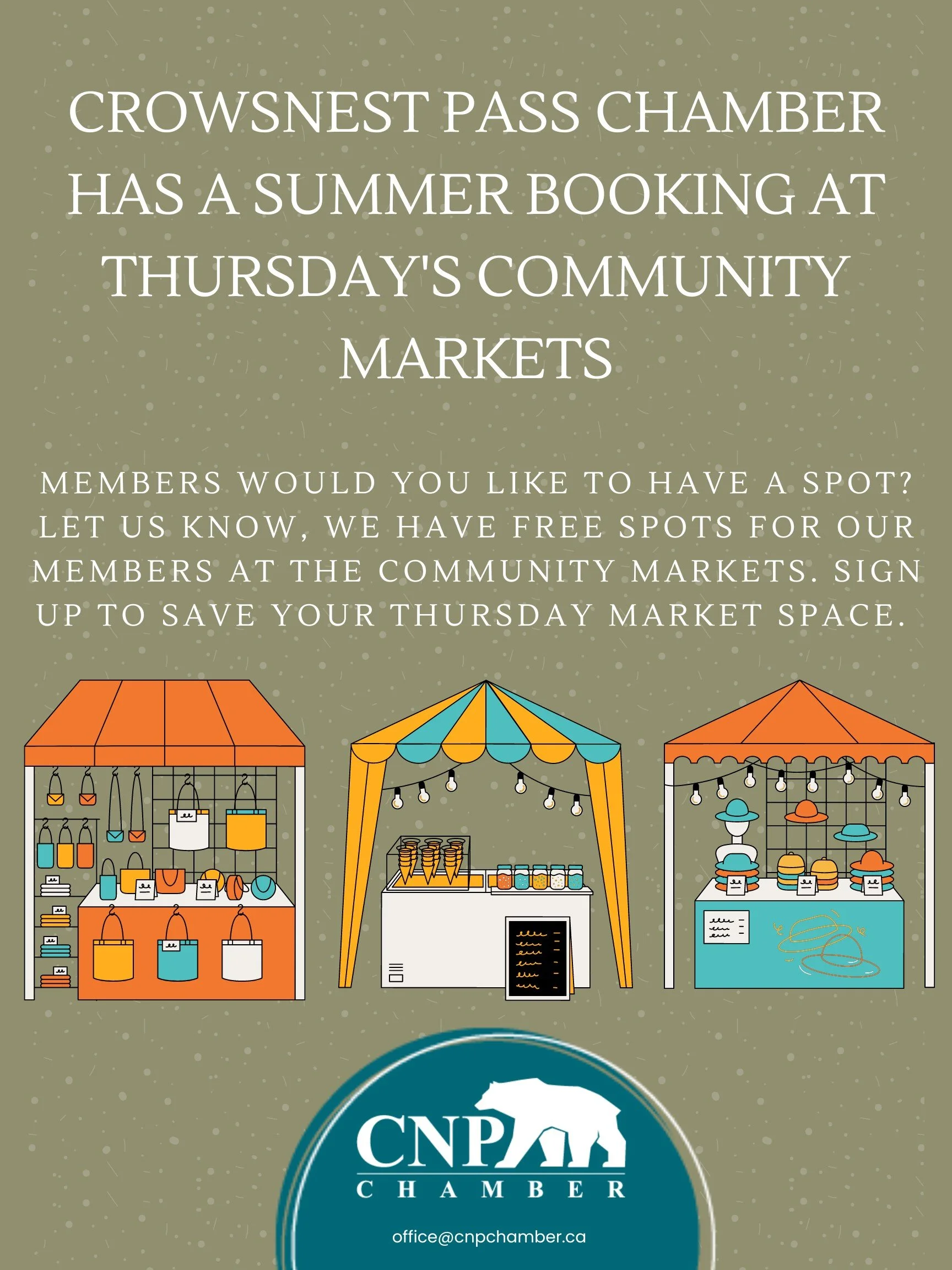 The chamber will attend the Crowsnest community market; We have a tent for our business members to sit and showcase your business.